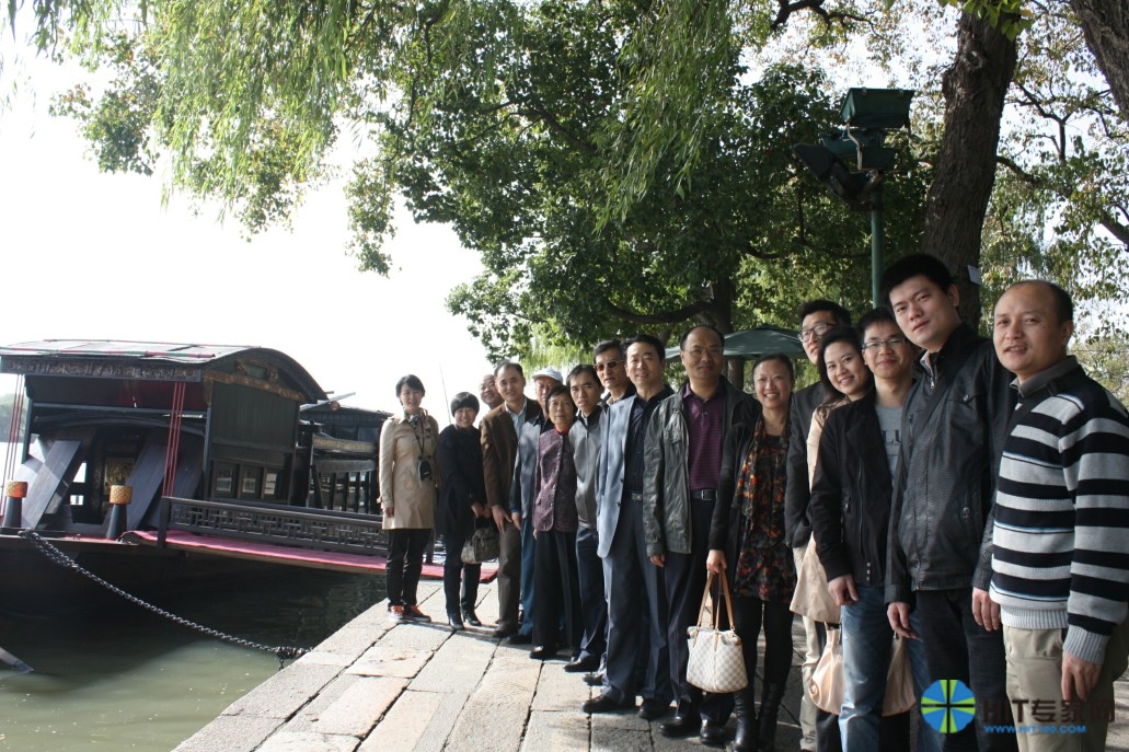 部分与会专家参观南湖革命圣地,在红船旁合影