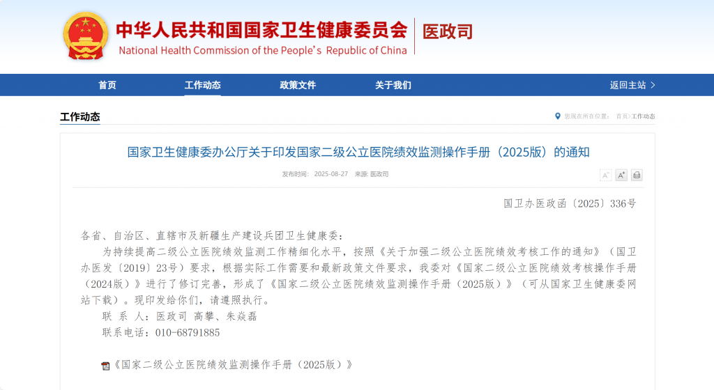 2025年8月27日,国家卫生健康委办公厅发布《关于印发国家二级公立医院绩效监测操作手册(2025版)的通知》(以下简称《通知》)。