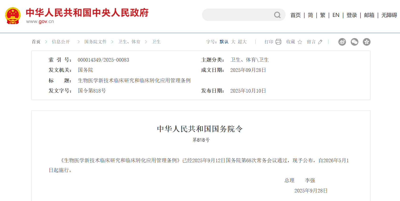 《生物医学新技术临床研究和临床转化应用管理条例》已经2025年9月12日国务院第68次常务会议通过,现予公布,自2026年5月1日起施行。