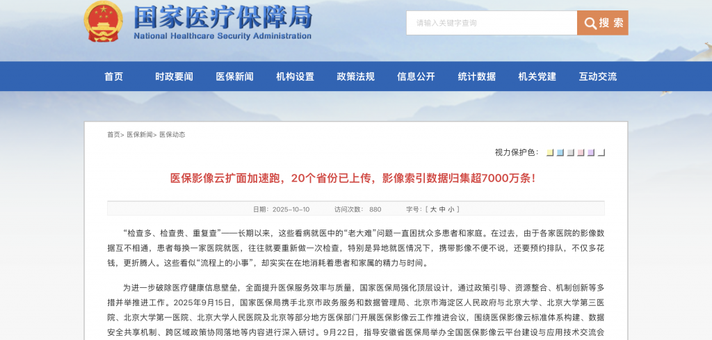 据国家医保局官网信息显示,截至2025年10月9日,全国医保影像云建设迎来突破性进展,20个省(自治区、直辖市)完成医保影像云软件部署,已向国家医保局上传索引数据累计7264余万条。