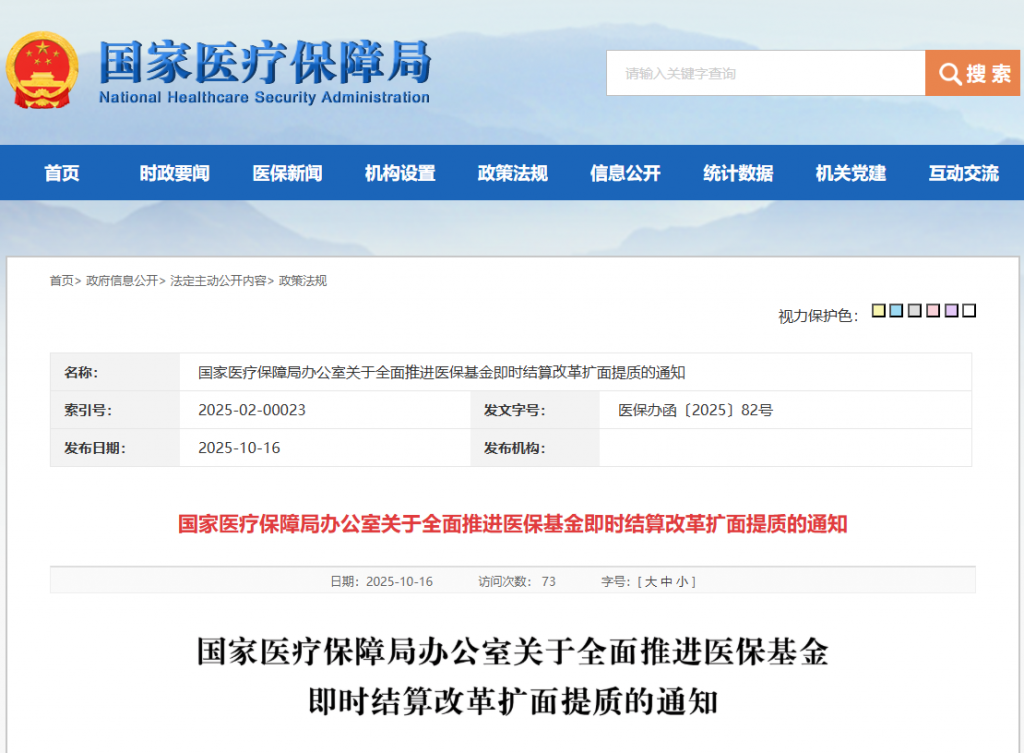10月16日,国家医疗保障局办公室发布《关于全面推进医保基金即时结算改革扩面提质的通知》(以下简称《通知》)。