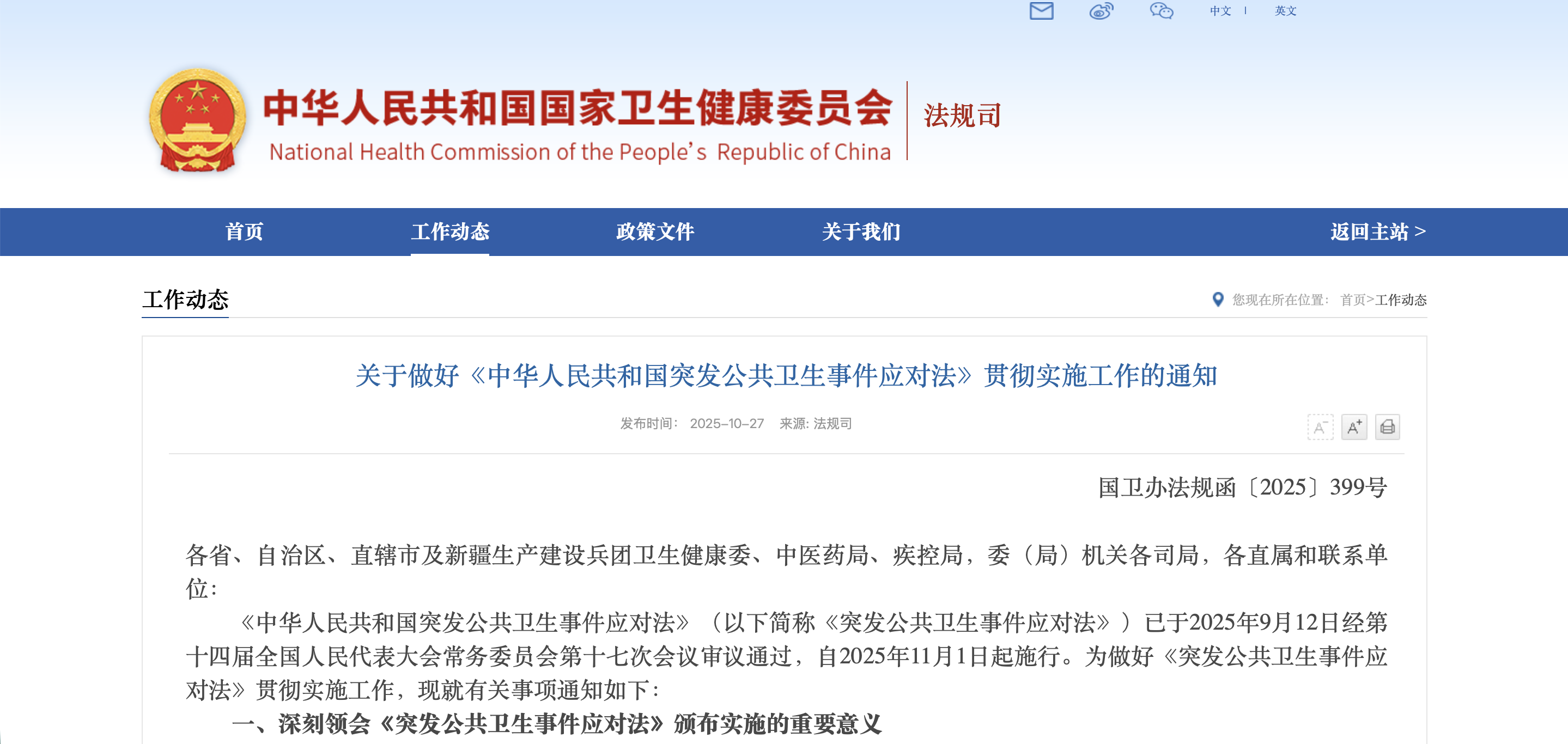 2025年10月27日,国家卫生健康委法规司发布关于做好《中华人民共和国突发公共卫生事件应对法》贯彻实施工作的通知(简称《通知》)。