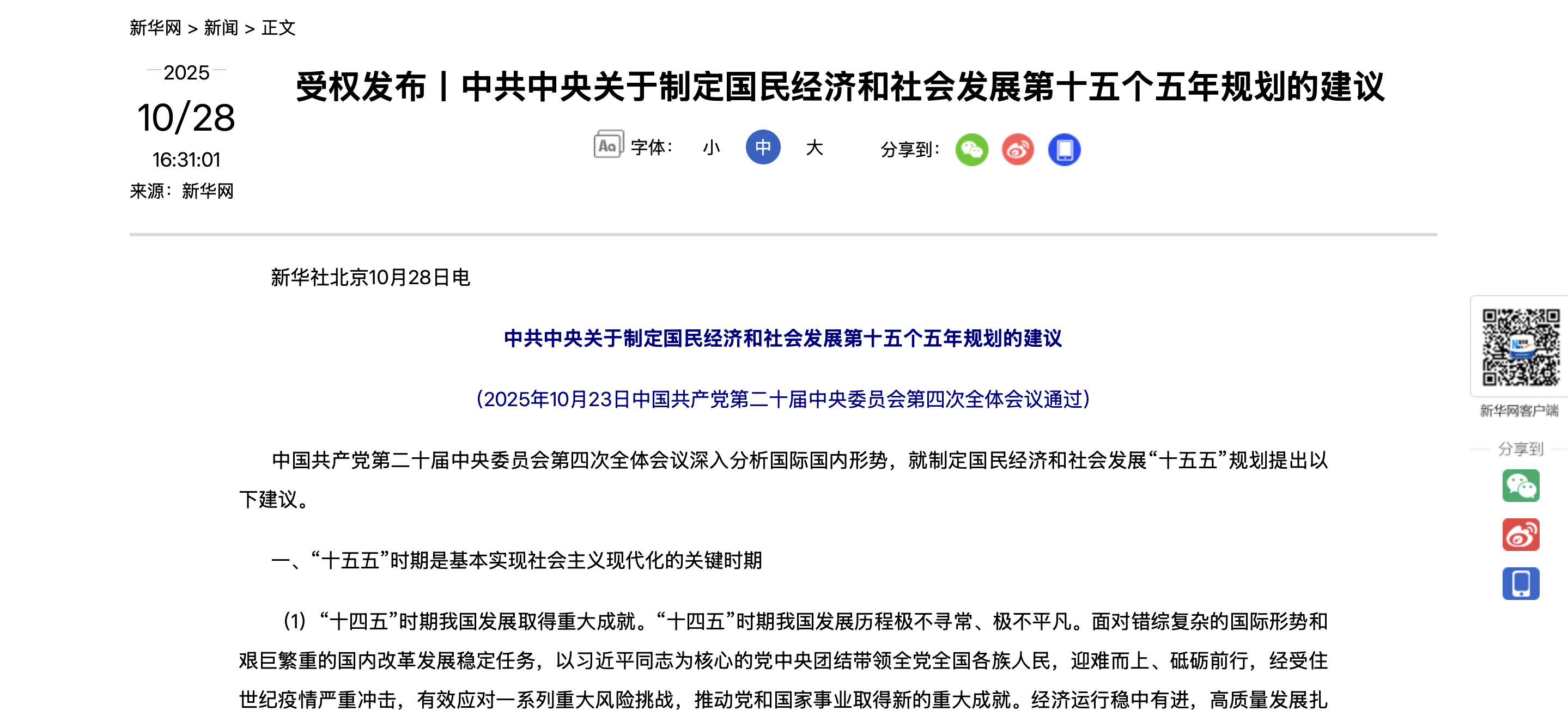 2025年10月28日,新华社受权发布了《中共中央关于制定国民经济和社会发展第十五个五年规划的建议》(以下简称《建议》)。《建议》稿由15个部分构成,分为总论、分论、第十五部分和结语三大板块。