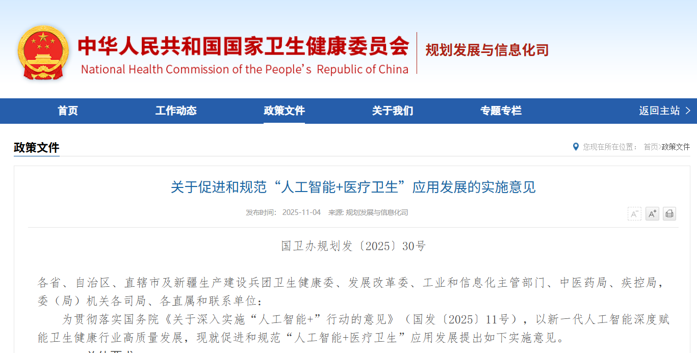 为贯彻落实国务院《关于深入实施“人工智能+”行动的意见》(国发〔2025〕11号),以新一代人工智能深度赋能卫生健康行业高质量发展,现就促进和规范“人工智能+医疗卫生”应用发展提出如下实施意见。