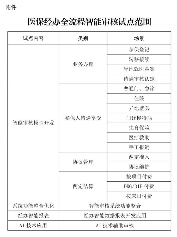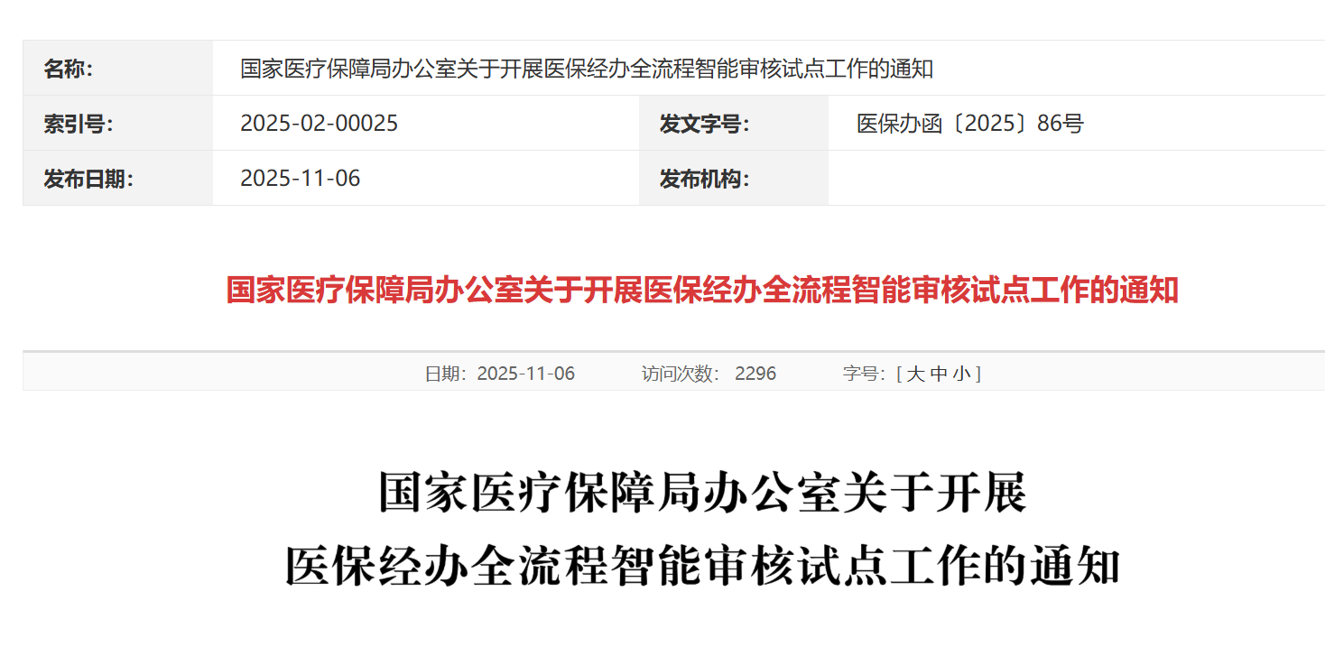 11月6日,国家医保局发布通知,确定北京、天津、河北、辽宁、浙江、湖南、重庆医疗保障局为试点单位,开展医保经办全流程智能审核工作,推动医保基金监管向全流程智能化转型。