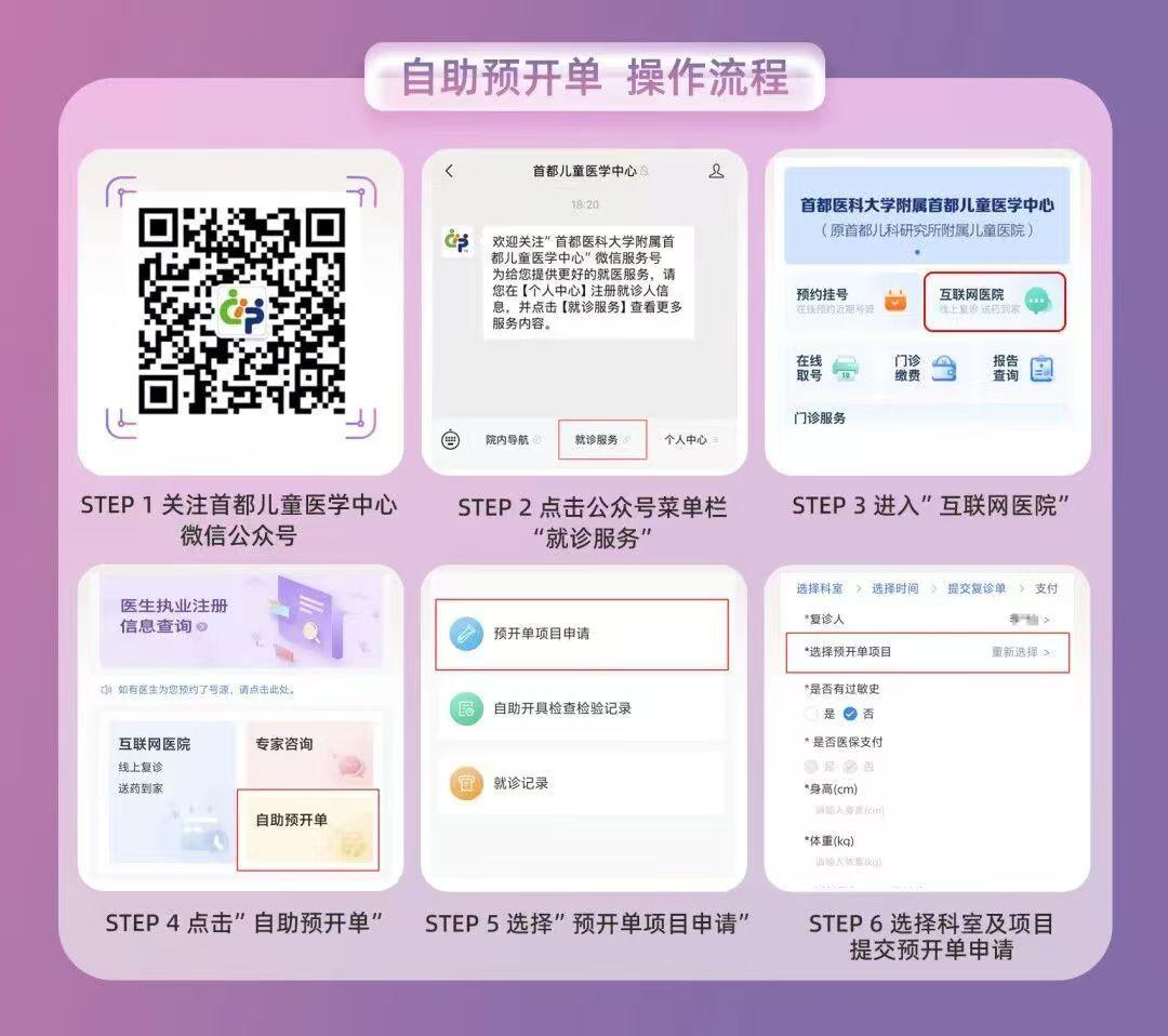 自助预开单功能开通后,患儿家长可在线提前选定所需检验检查项目,患儿到院后直接前往对应科室完成检查,告别了“院内开单-缴费-排队”的传统流程,大幅提升就医效率。具体操作方式是,关注“首都儿童医学中心”微信公众号,通过“就诊服务-互联网医院-自助预开单”模块,根据患儿复查需求勾选项目并提交申请。审核通过后,在线缴费即可自动生成检查预约。同时支持线上实时查询预约时间、修改预约信息。