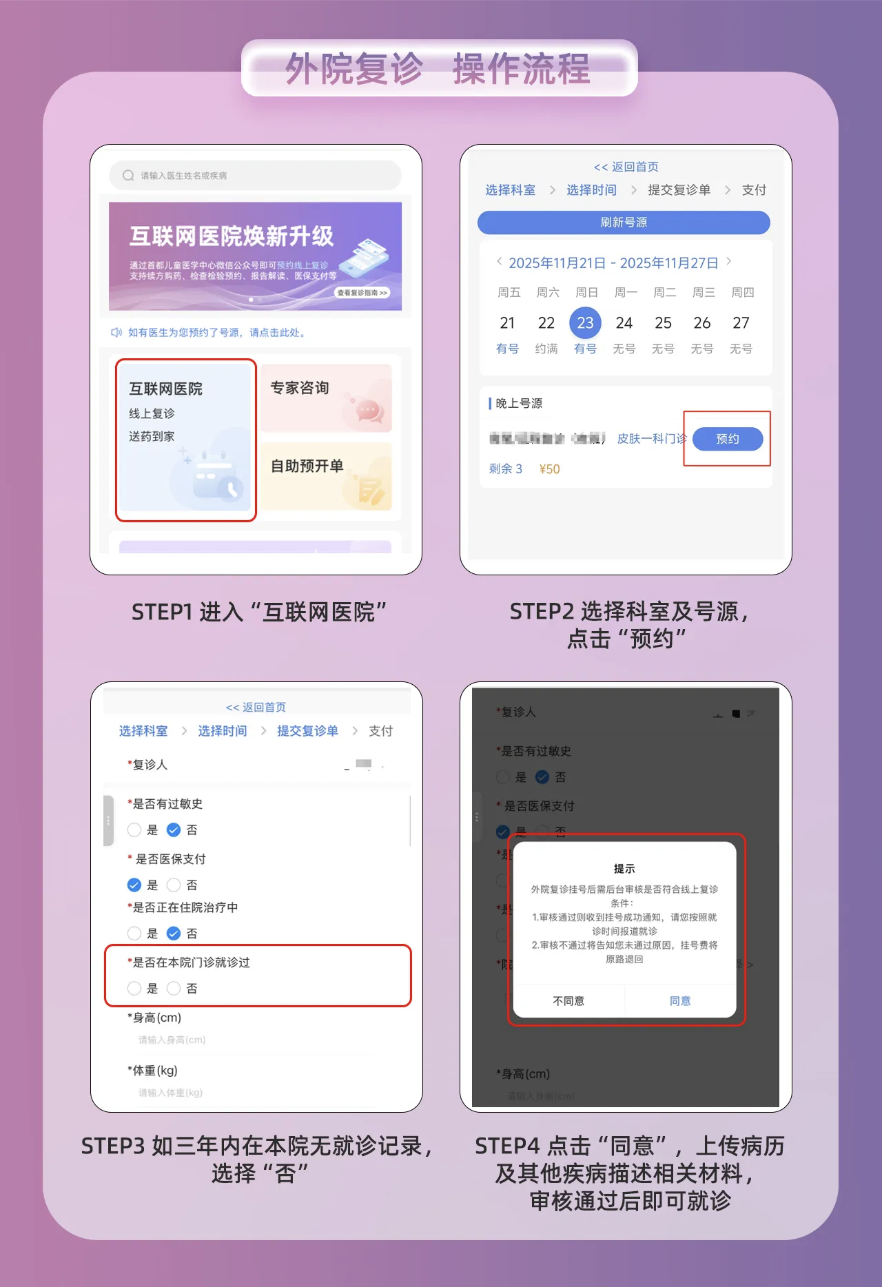 首都医科大学附属首都儿童医学中心互联网医院新增外院确诊患者线上复诊通道,打破了就医地域与场景限制,让更多患者无需线下跑腿即可享受医疗服务。患者在申请线上复诊时,需上传首诊病历、化验单、检查报告、既往处方单等病情相关资料,经专业审核通过后,患者按系统提示的就诊时间报到,即可开启线上诊疗。若审核未通过,患者将收到通知,已缴挂号费将全额退回。