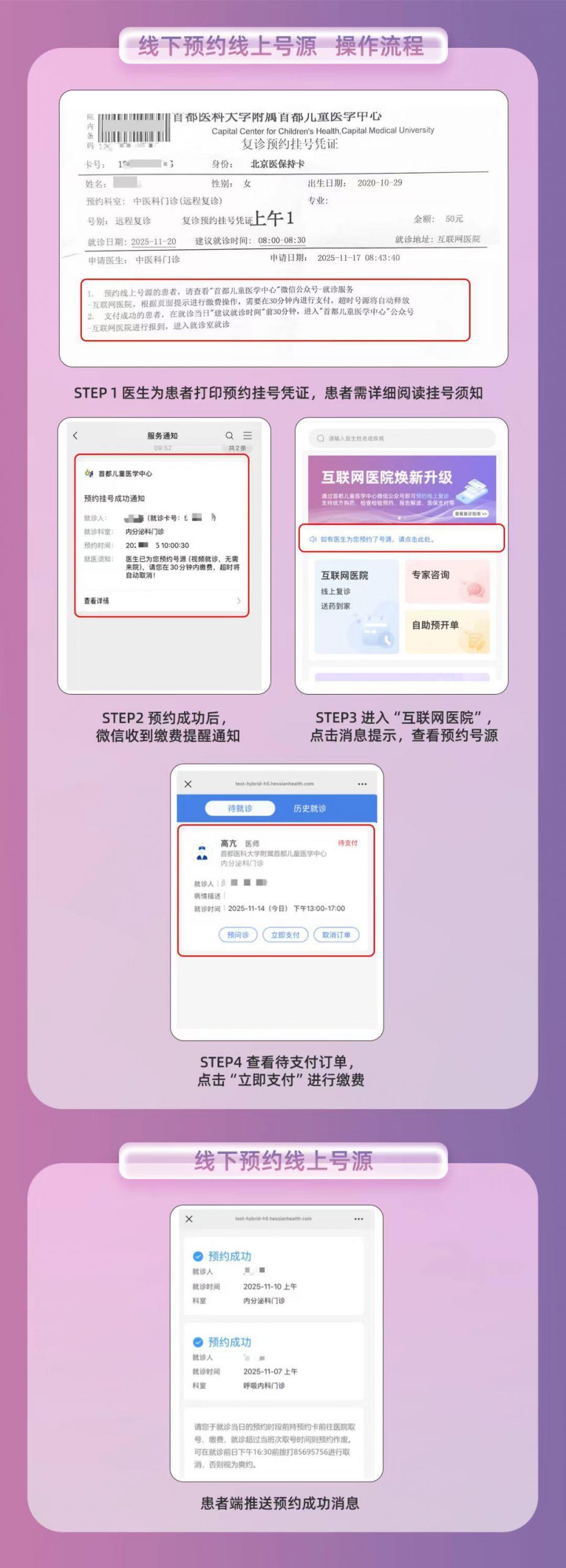 据悉,首都医科大学附属首都儿童医学中心互联网医院此次升级的核心亮点之一,是构建了“线下导线上、线上转线下”的双向服务模式。在线下门诊中,医生可根据患者病情直接预约下一次互联网线上复诊号源,患者3分钟内线上完成支付即可锁定号源,无需后续抢号预约。若患者正在进行线上复诊,医生经评估后,如需进一步线下检查或面诊,也可直接预约线下门诊号源。