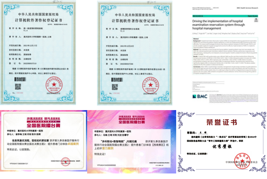荣誉与成果认可:通过总结该项目经验,获得软著2项、SCI论文(影响因子2.78)1篇、行业竞赛(中国医院信息网络大会、改善医疗行动计划全国擂台赛等)获奖3项。