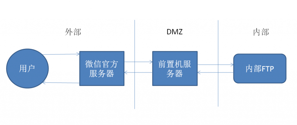 2.采用微信官方图片服务器作为中转,用户发送图片和文件后,首先会上传到微信的官方服务器,然后机器人自动下载到前置机服务器,前置机服务器运行杀毒软件进行查杀后,转移到内网用户FTP目录下。如图1所示。