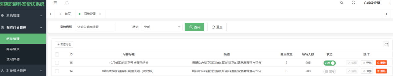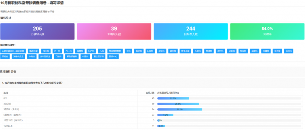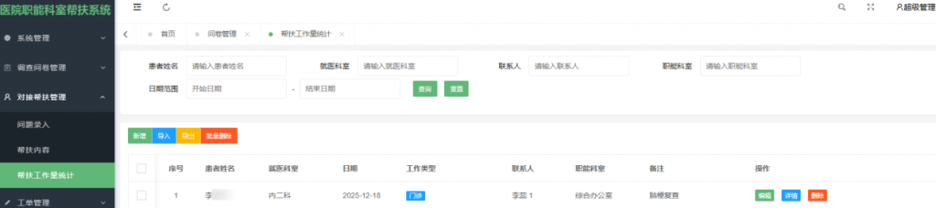 传统模式下,职能科室与临床科室的信息传递多依赖线下沟通,存在信息滞后、碎片化等问题。该系统将临床科室的满意度反馈与职能科室的帮扶工作量实时记录、同步共享,让双方清晰掌握协作动态。