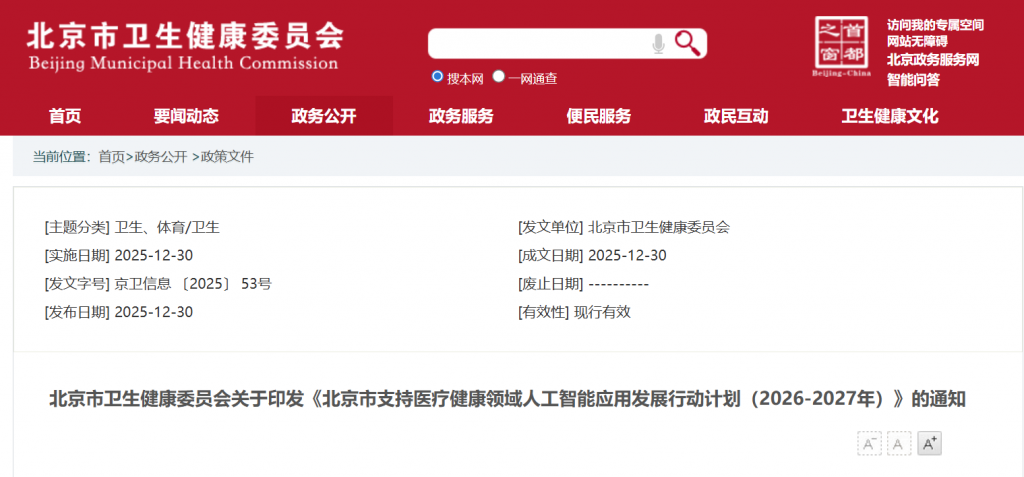 12月30日,北京市卫健委印发《北京市支持医疗健康领域人工智能应用发展行动计划(2026-2027年)》(以下简称《行动计划》),部署医疗健康领域人工智能应用发展的重点任务。
