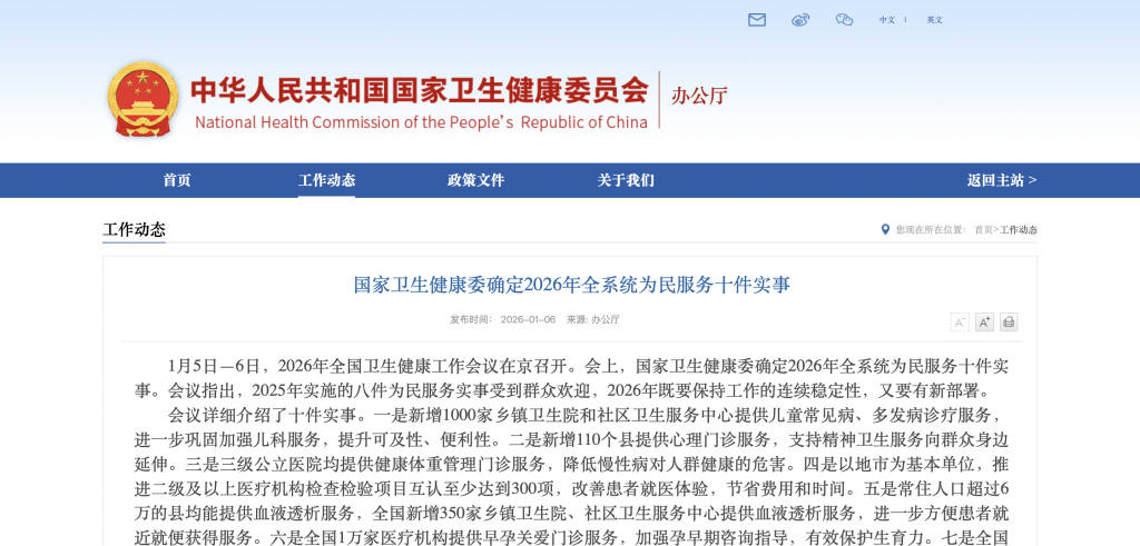 2026年1月5日—6日,2026年全国卫生健康工作会议在京召开。会上,国家卫生健康委确定2026年全系统为民服务十件实事,包括: