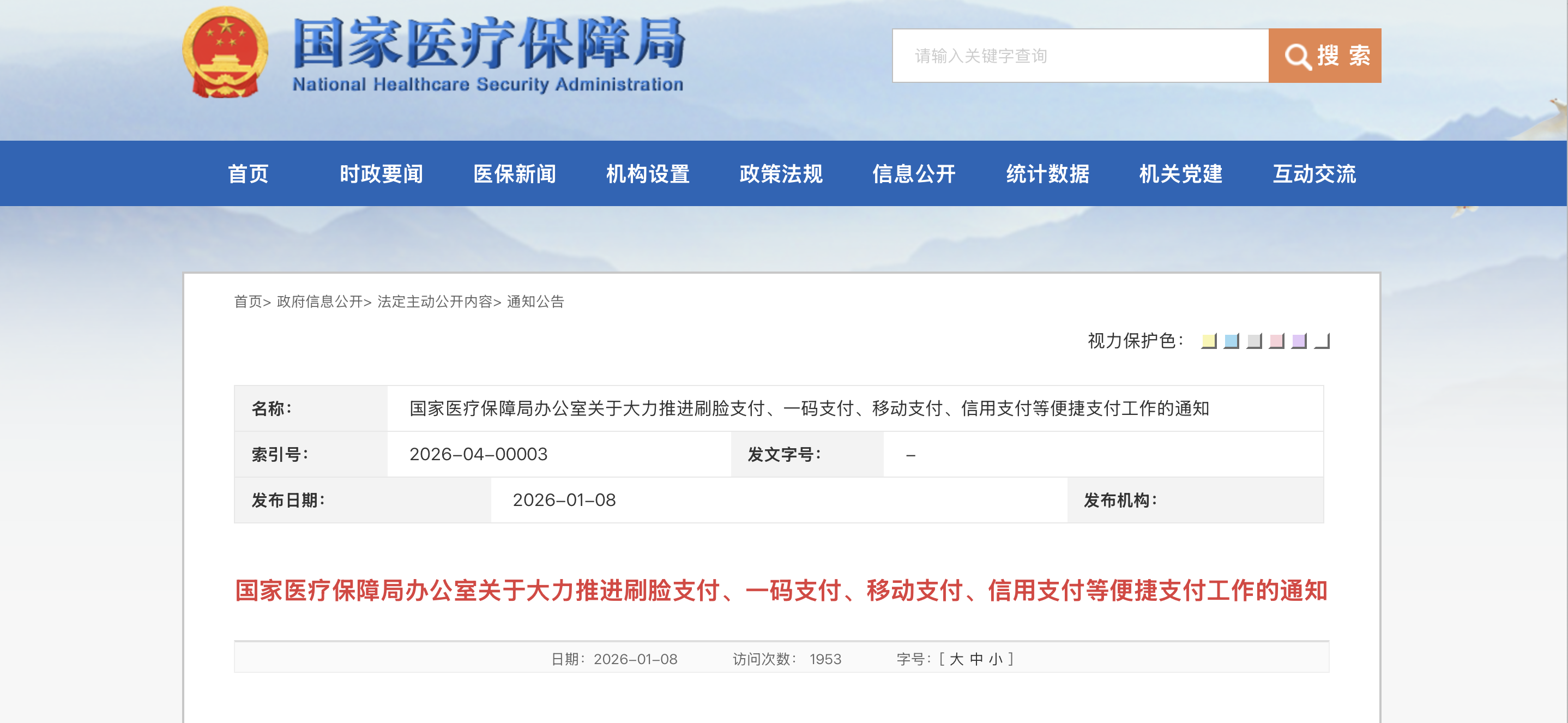 2026年1月8日,为深入贯彻落实党的二十届四中全会精神,优化医保支付政策,国家医疗保障局办公室印发《关于大力推进刷脸支付、一码支付、移动支付、信用支付等便捷支付工作的通知》(以下简称《通知》)。