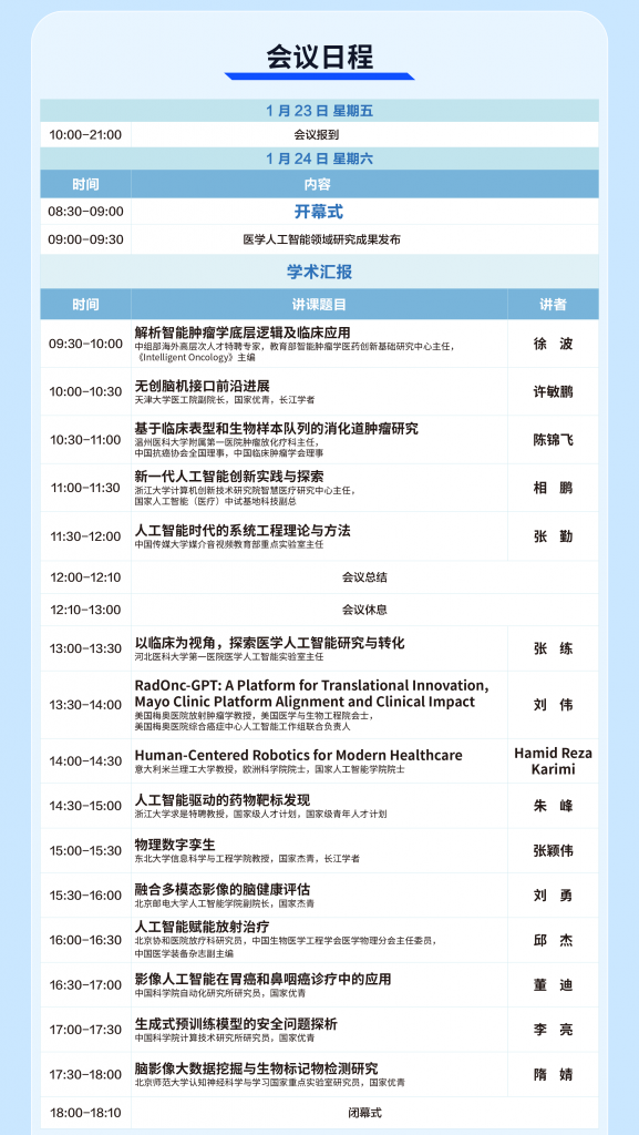本次会议将以“创新智能技术,赋能精准医疗——共探医学人工智能发展新路径”为主题,特邀国内外多家权威机构专家聚焦前沿技术突破、转化应用实践开展深度交流。会议将同步进行线上直播。