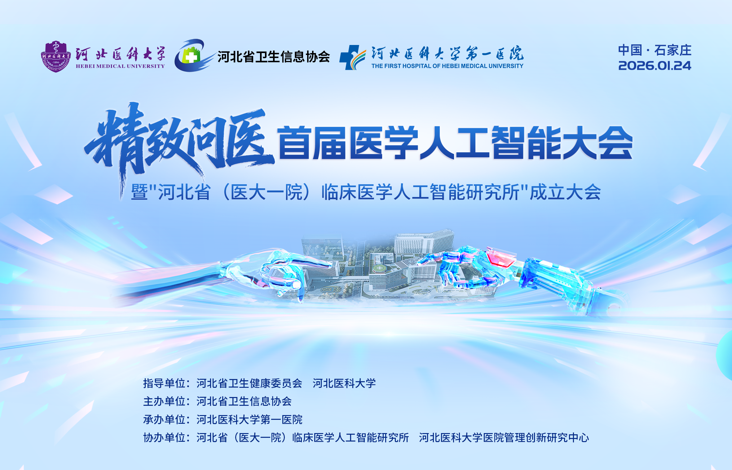 为深入贯彻落实《国务院关于印发新一代人工智能发展规划的通知》(国发(2017)35号)关于推动人工智能与医疗健康深度融合的战略部署,加速培育人工智能驱动的医疗卫生领域新质生产力,深化人工智能在疾病诊疗、健康管理、科研创新等场景的应用实践,河北省卫生信息协会定于2026年1月24日在河北省石家庄市召开“精致问医”首届医学人工智能大会暨河北省(医大一院)临床医学人工智能研究所成立大会。