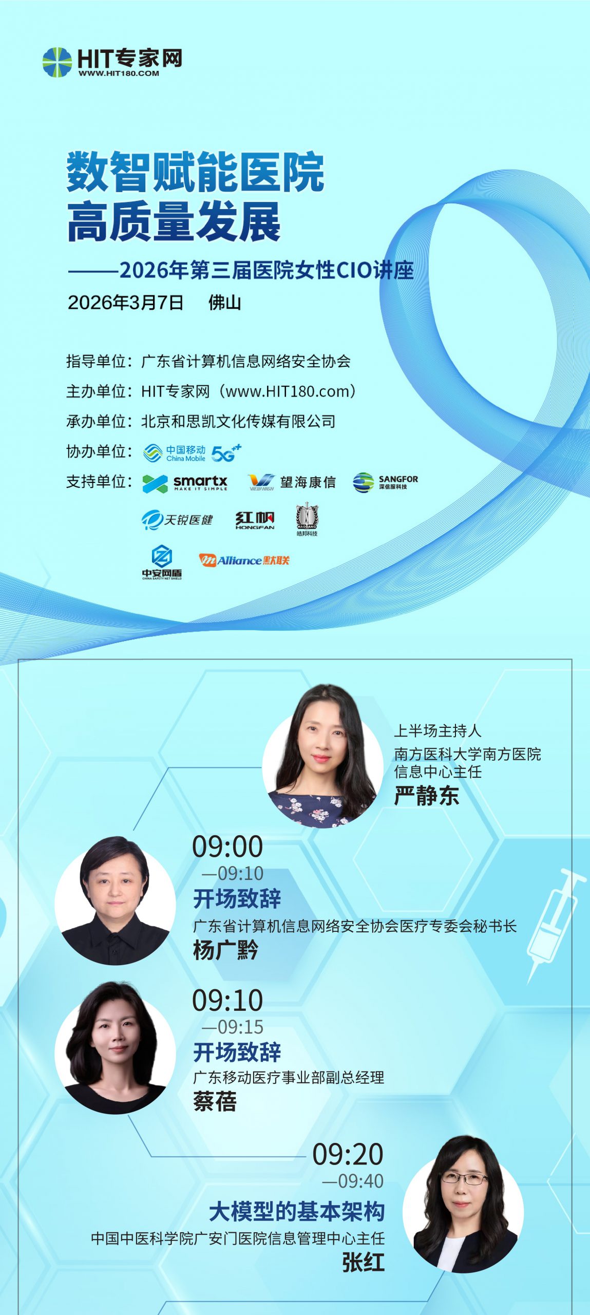 步入“十五五”开局之年,在国家确定“强基、稳二、控三”的原则下,医疗服务体系发展迎来深层次变革。数智赋能公立医院高质量发展,成为医院信息部门的重要使命担当。由HIT专家网主办的“数智赋能医院高质量发展——2026年第三届医院女性CIO讲座”,定于2026年3月7日(星期六)在素有“玫瑰城”之称的广东佛山举办。