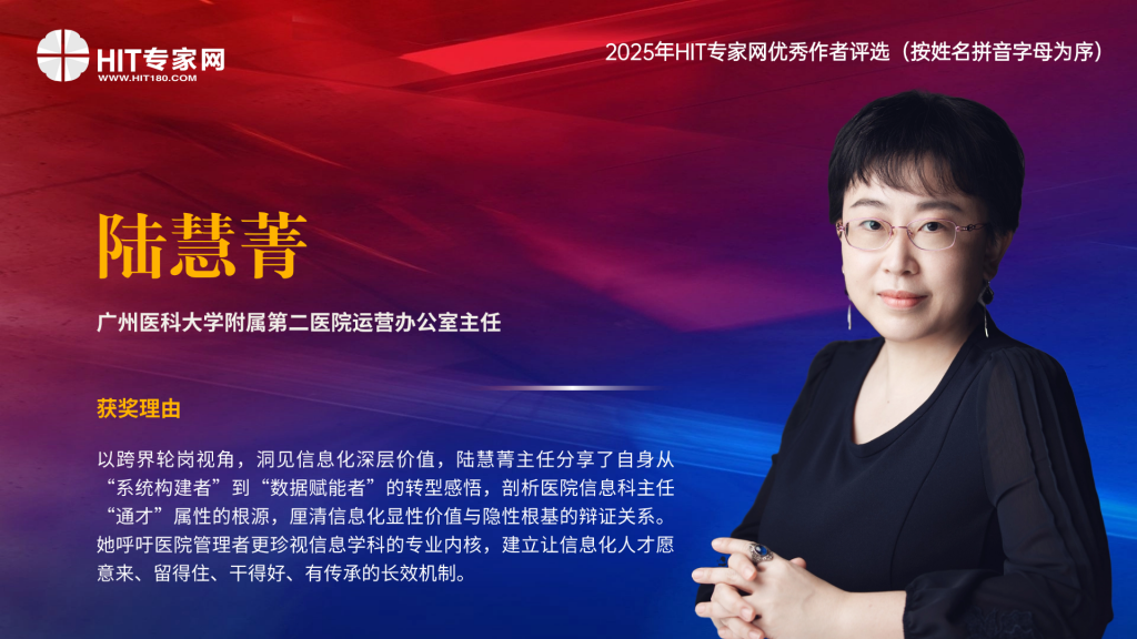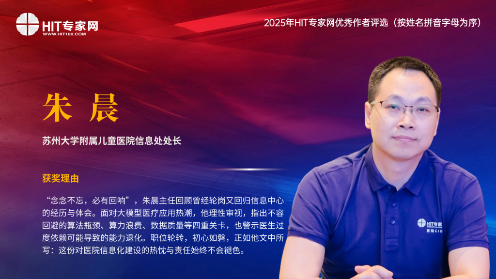 2025年,HIT专家网共计收到来自医疗机构、学界、医疗IT企业的作者投稿超过90篇。依照选题时效性(分值占比20%)、内容实用性(20%)、内容思想性(20%)、写作水平(15%)、阅读量(25%)等指标设定,HIT专家网编委会对所有作者投稿进行综合评选,并最终确定2025年HIT专家网优秀作者名单。