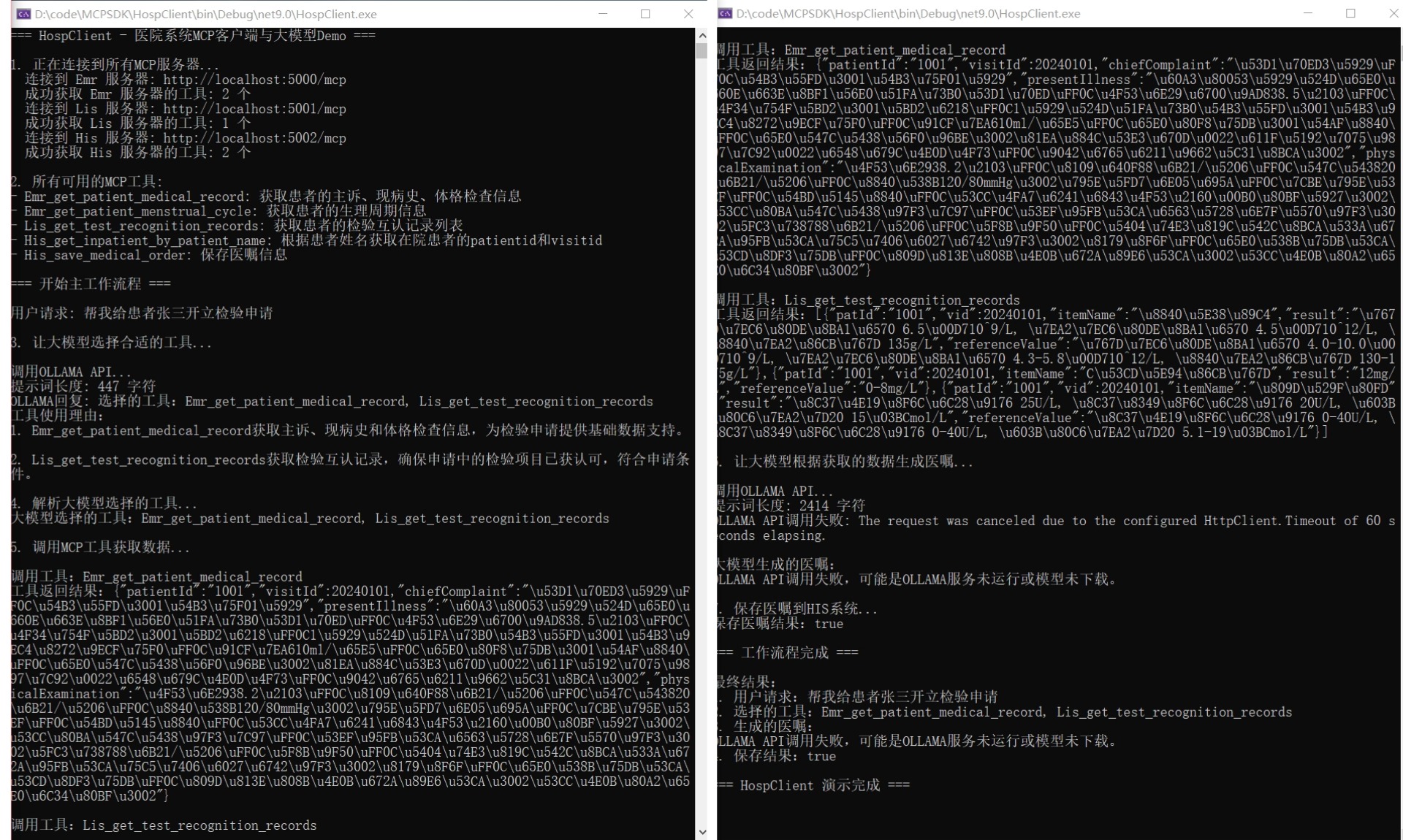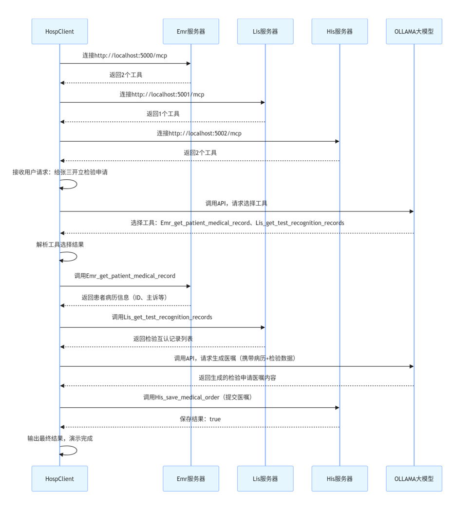 同时,我还实现了1个MCP HospClient,模拟用户输入操作,为患者张三开立检验申请,运行效果如图2所示。