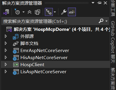 (1)HisAspNetCoreServer,用于连接HIS数据库,提供2个MCP Tools,功能为保存医嘱信息、根据患者姓名获取在院患者的PatientId和VisitId。