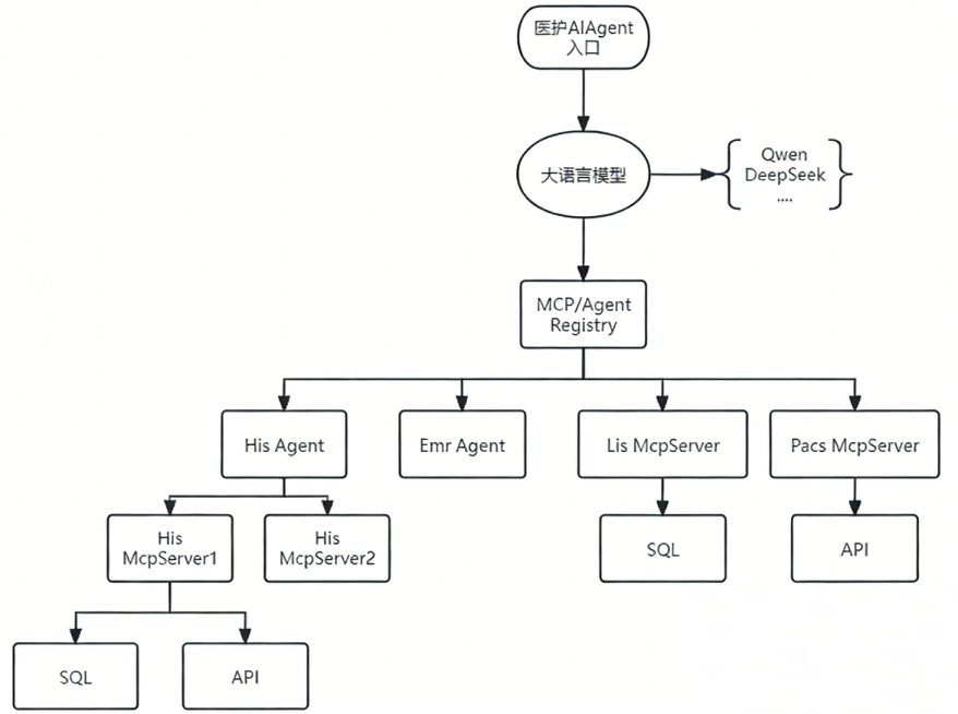 传统的图形化操作界面,在没有源代码的情况下,往往难以甚至无法修改,接口交互的优化也需要厂商对UI层进行调整才能实现。而封装了MCP Server,医院就有机会通过AI Agent或者MCP Client工具实现接口调用,从而避开因需修改UI层产生的接口费用(当然,新增功能的接口不在这个范畴之内,也望大家勿喷如何获取数据库结构,数据本来就应该属于医院的)。我构想的架构图也如图4所示。
