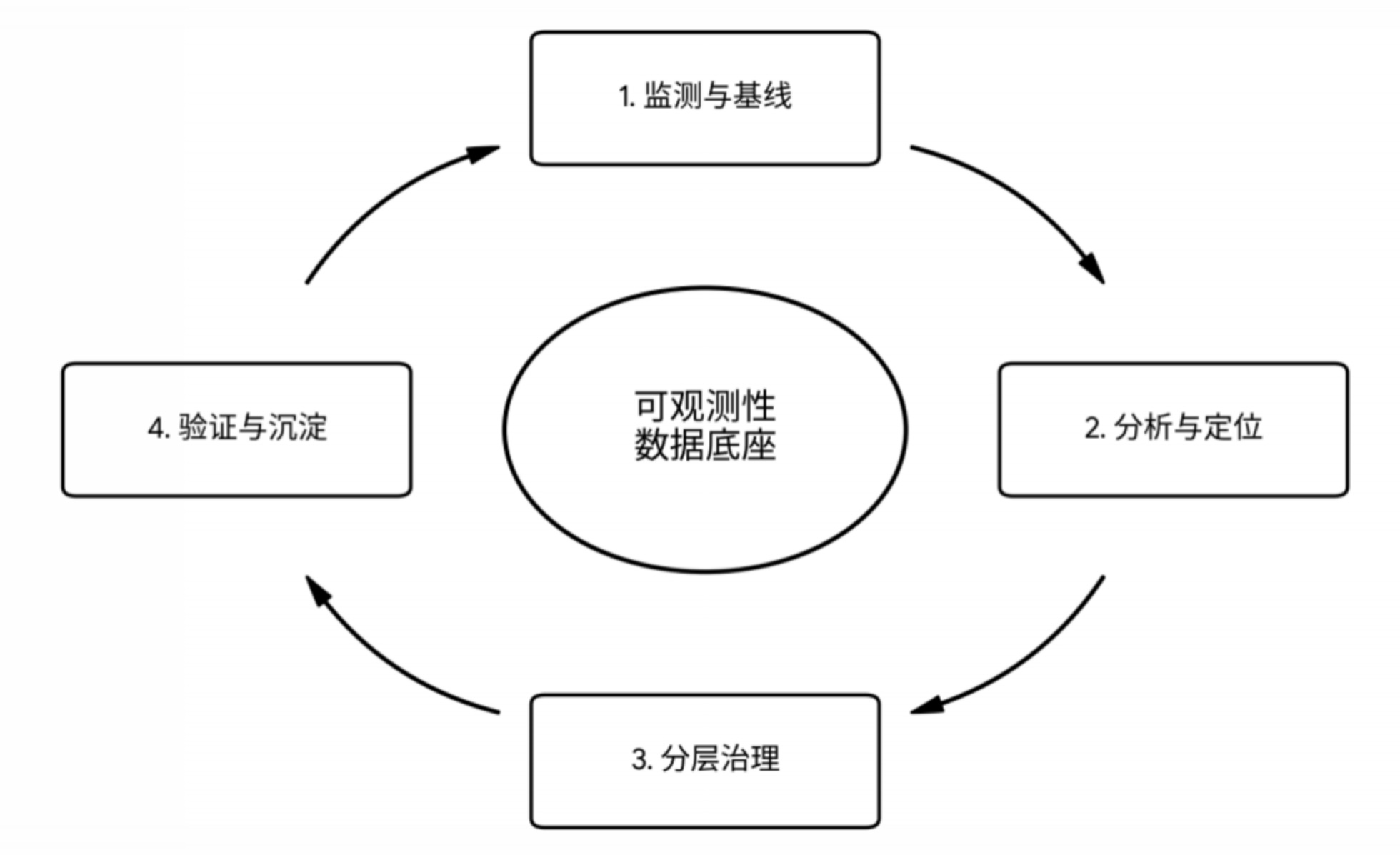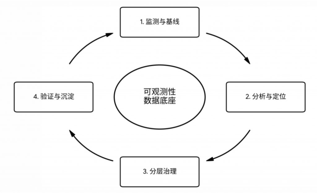 信息部技术团队确立了“可观测性驱动、分层协同治理”的总体原则,构建了闭环治理体系(如图1所示):