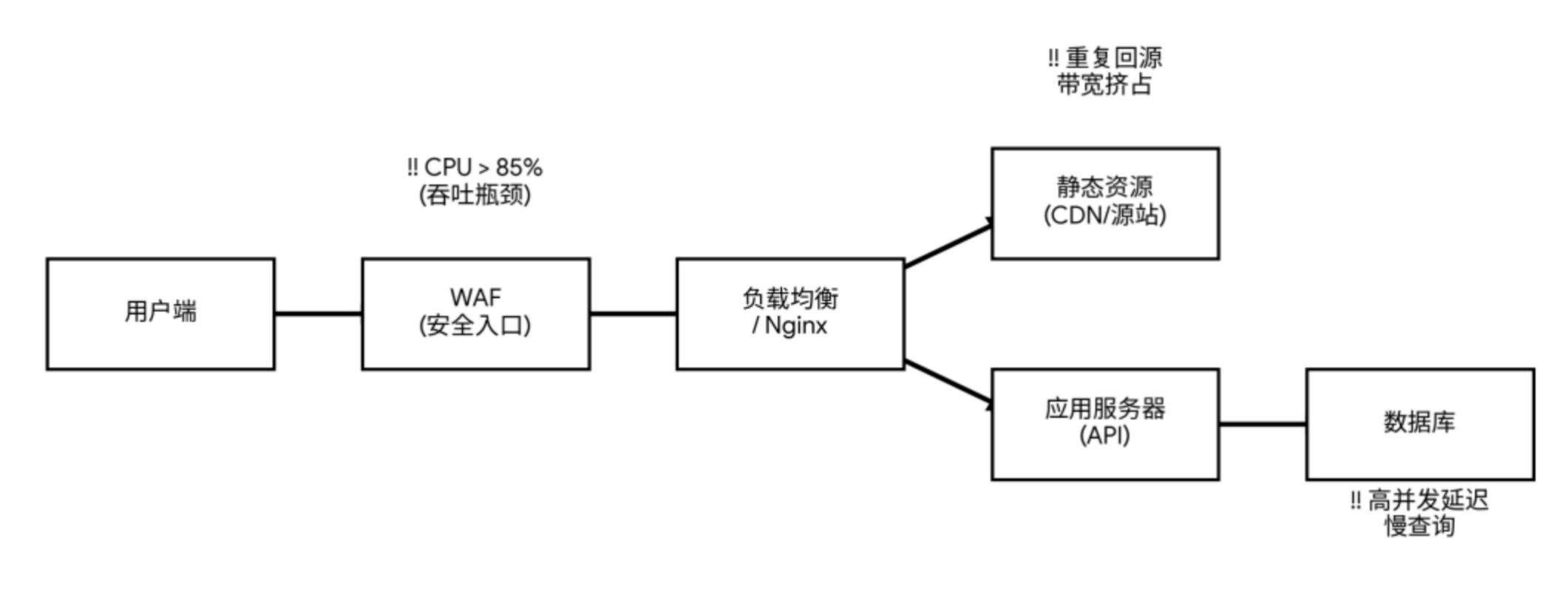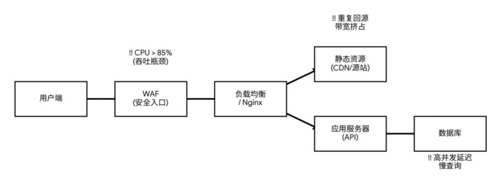 入口瓶颈显著:WAF在峰值时段CPU长期超过85%,成为吞吐约束点。