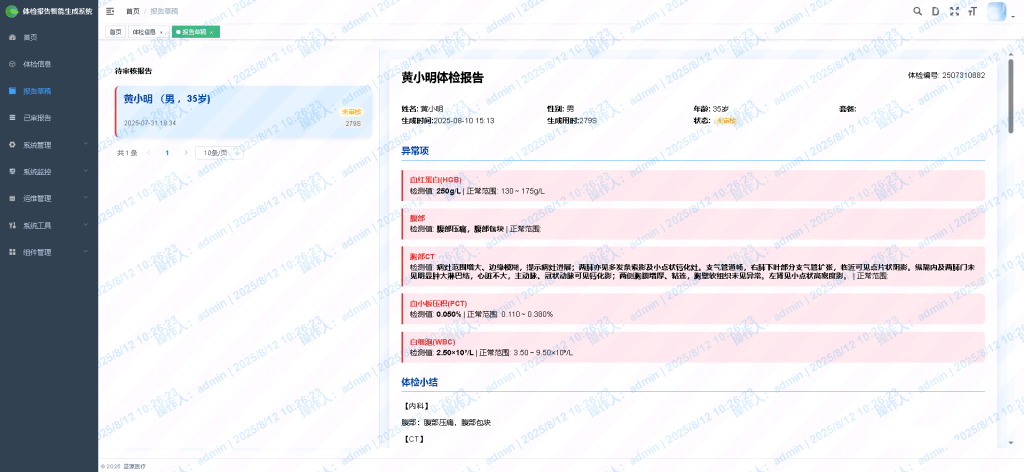 3.医疗资源价值未最大化。高年资医生被动陷入繁多的报告分析与文书工作中,无法将其专业知识和精力聚焦于最核心的报告审核、异常结果研判、风险评估及对参检人员的深度健康指导上,造成了优质医疗资源的浪费。