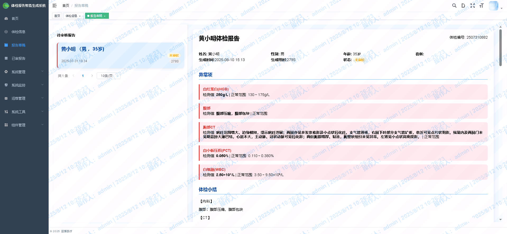 1.业务效率瓶颈突出。医生需耗费大量时间与精力,人工提取、整理和核对体检数据,体检报告的生成耗时较长。在体检高峰期,极易造成报告积压,导致患者等待时间过长,直接影响就医满意度与体验。