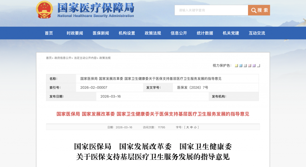 2026年3月16日,国家医保局、国家发展改革委、国家卫生健康委发布《关于医保支持基层医疗卫生服务发展的指导意见》(以下简称《指导意见》)。