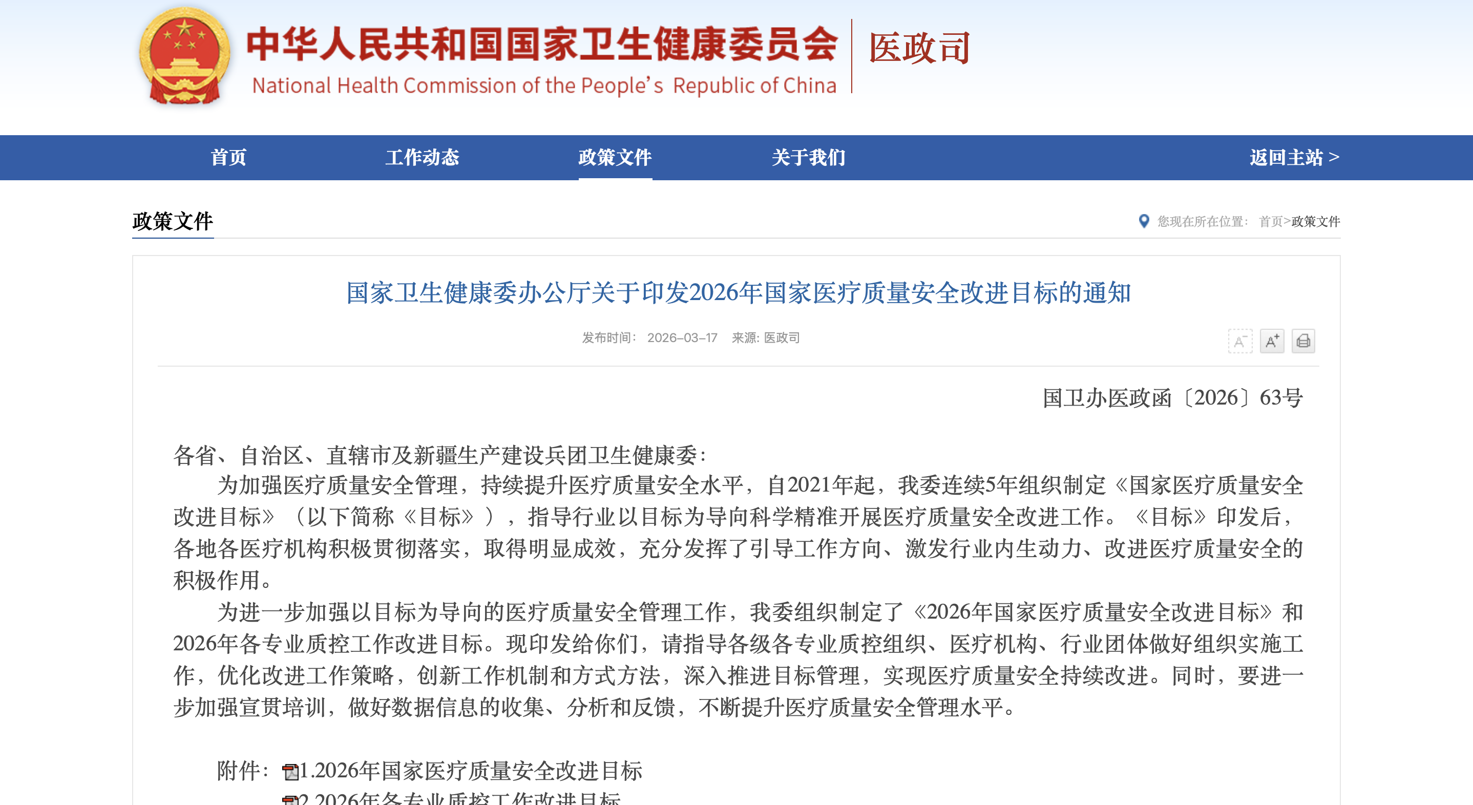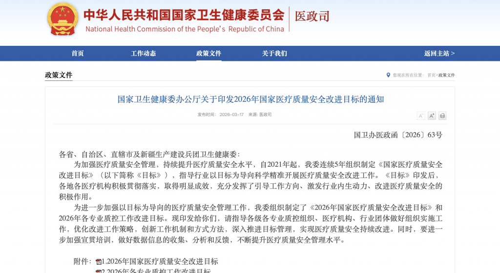 国家卫生健康委办公厅关于印发2026年国家医疗质量安全改进目标的通知