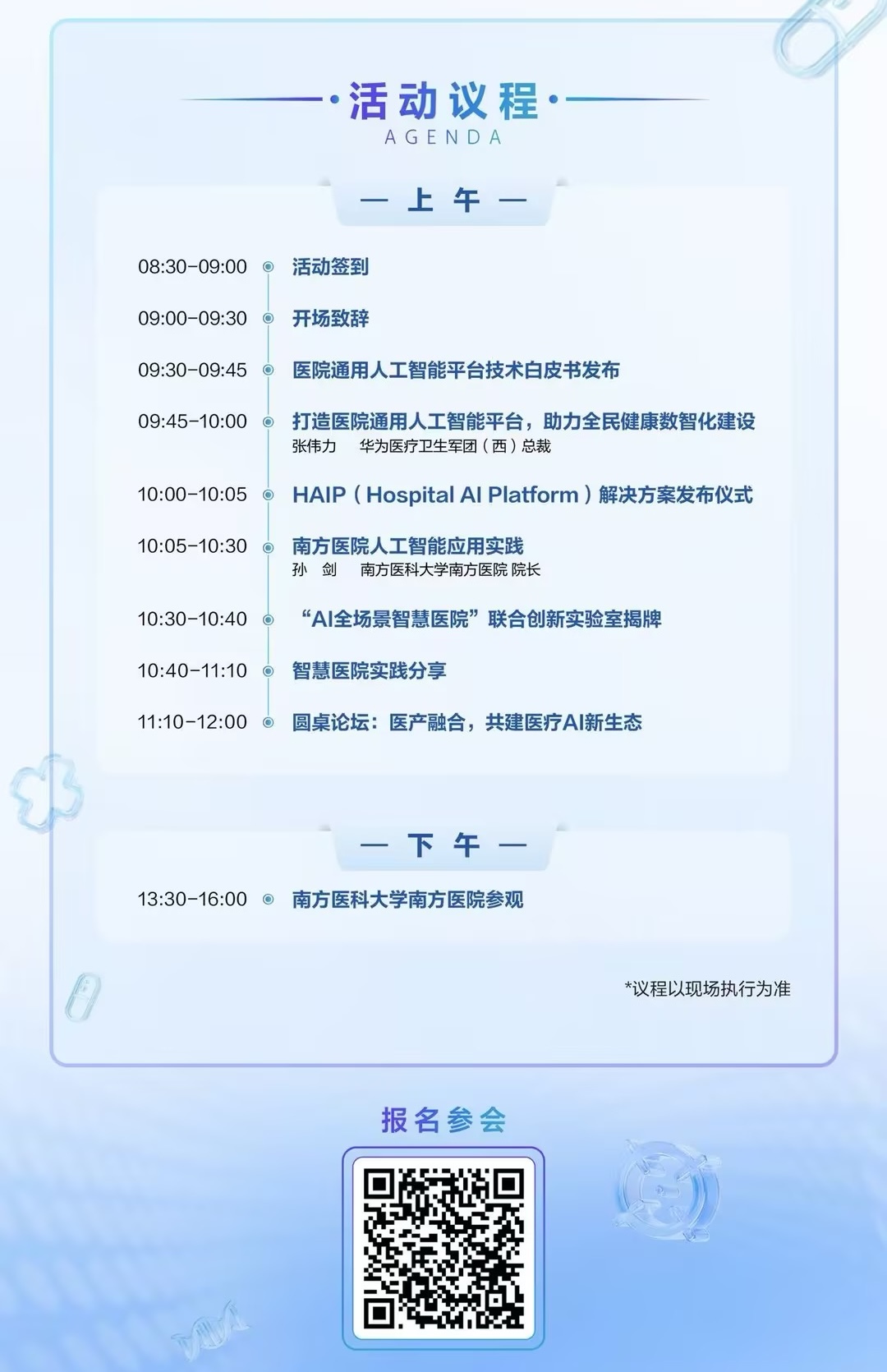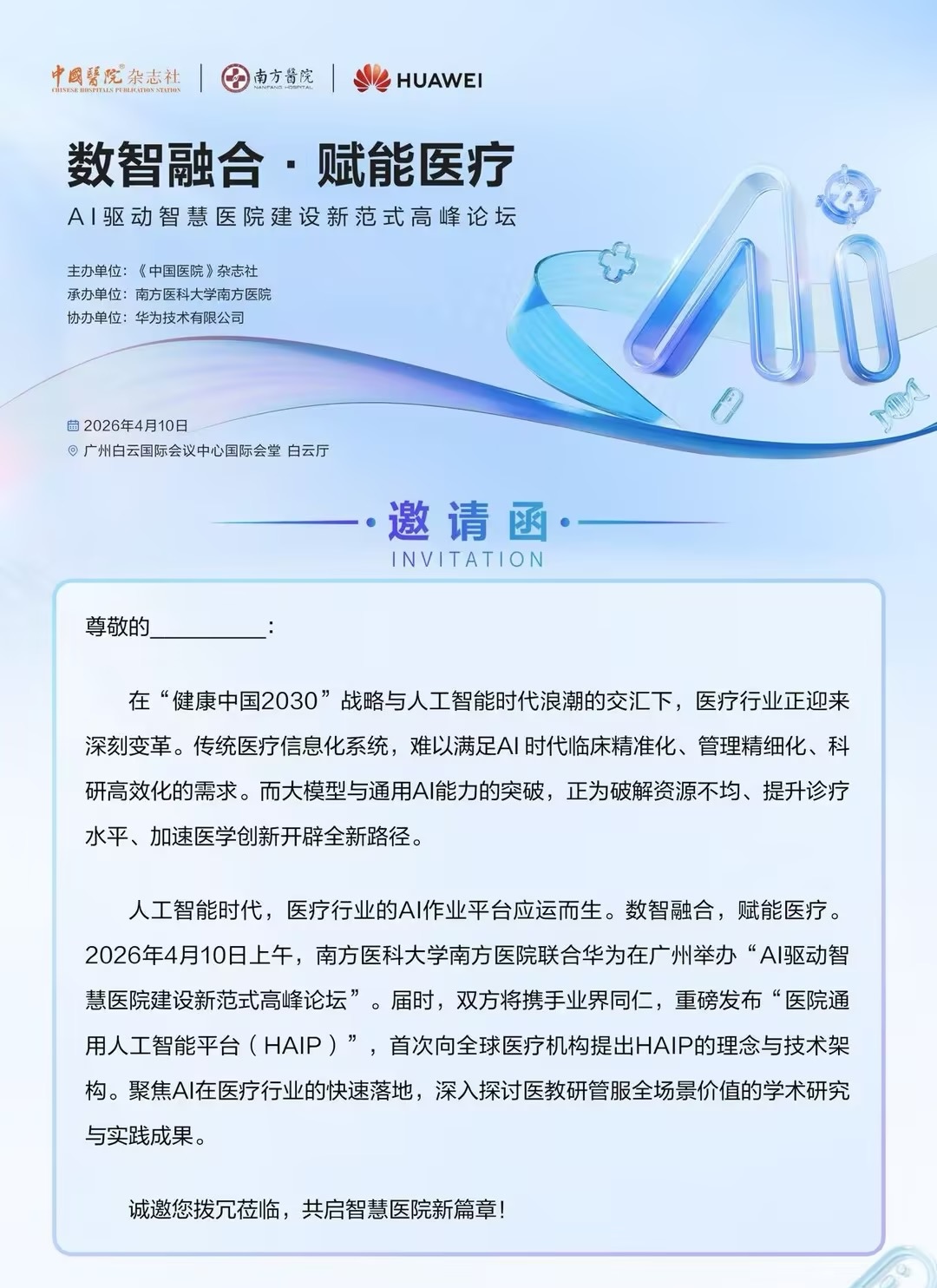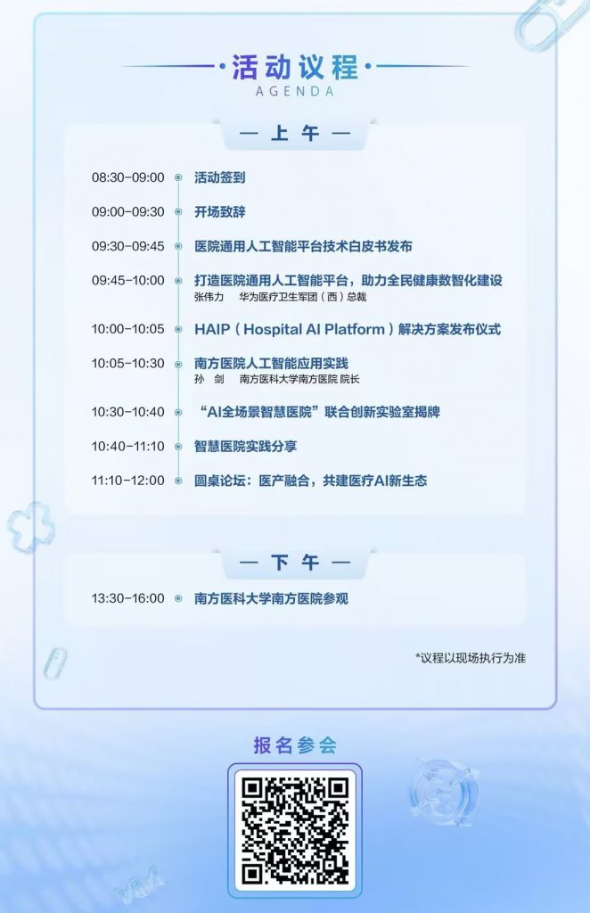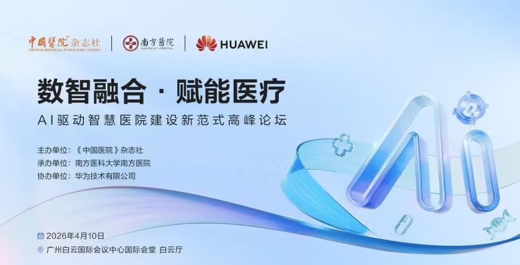 2026年4月10日上午,南方医科大学南方医院将联合华为在广州举办“AI驱动智慧医院建设新范式高峰论坛”。届时,双方将携手业界同仁,重磅发布“医院通用人工智能平台(HAIP)”,首次向全球医疗机构提出HAIP的理念与技术架构。聚焦AI在医疗行业的快速落地,深入探讨医教研管服全场景价值的学术研究与实践成果。