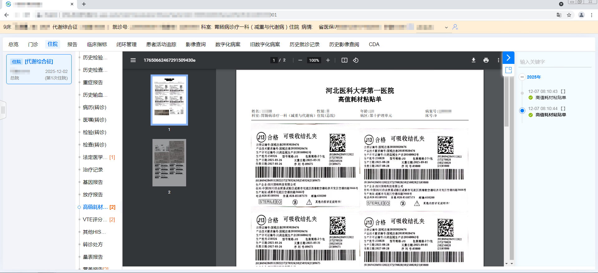 手术结束后,护士不再需要费力地剪下高值耗材包装上的一个个小合格证、小心翼翼地贴在病历上。取而代之的,是扫码枪“嘀”一声后的自动归档。河北医科大学第一医院(以下简称河北医大一院)通过深度融合SPD与电子病历系统,构建了一套高值耗材电子追溯系统,不仅让合格证上传率和追溯准确率达到100%,更让高值耗材病历归档效率大幅提升,以“AI+供应链”的数字化实践,精准破解医用高值耗材管理痛点,筑牢医疗质量安全防线。