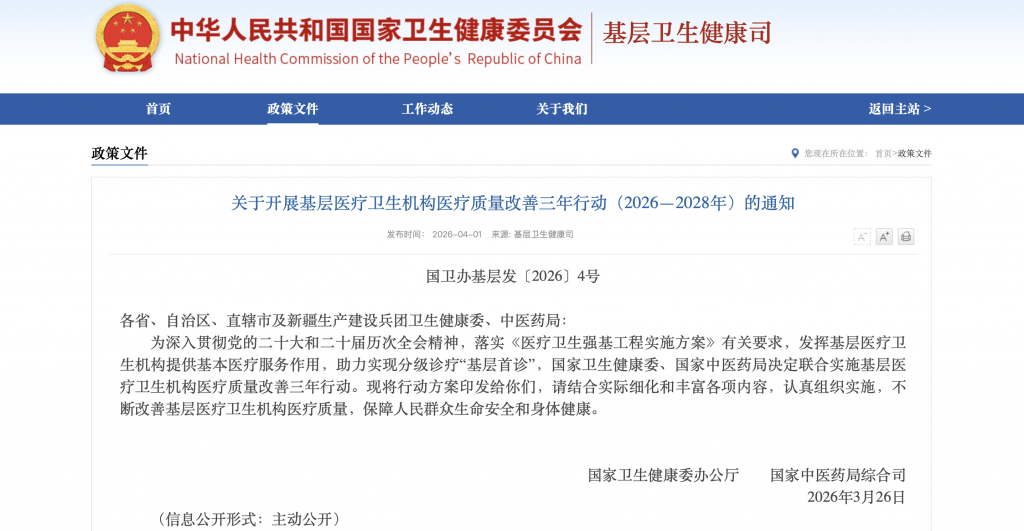 2026年4月1日,国家卫生健康委办公厅会同国家中医药局综合司印发《关于开展基层医疗卫生机构医疗质量改善三年行动(2026—2028年)的通知》(以下简称“基层医疗质量改善三年行动”)。