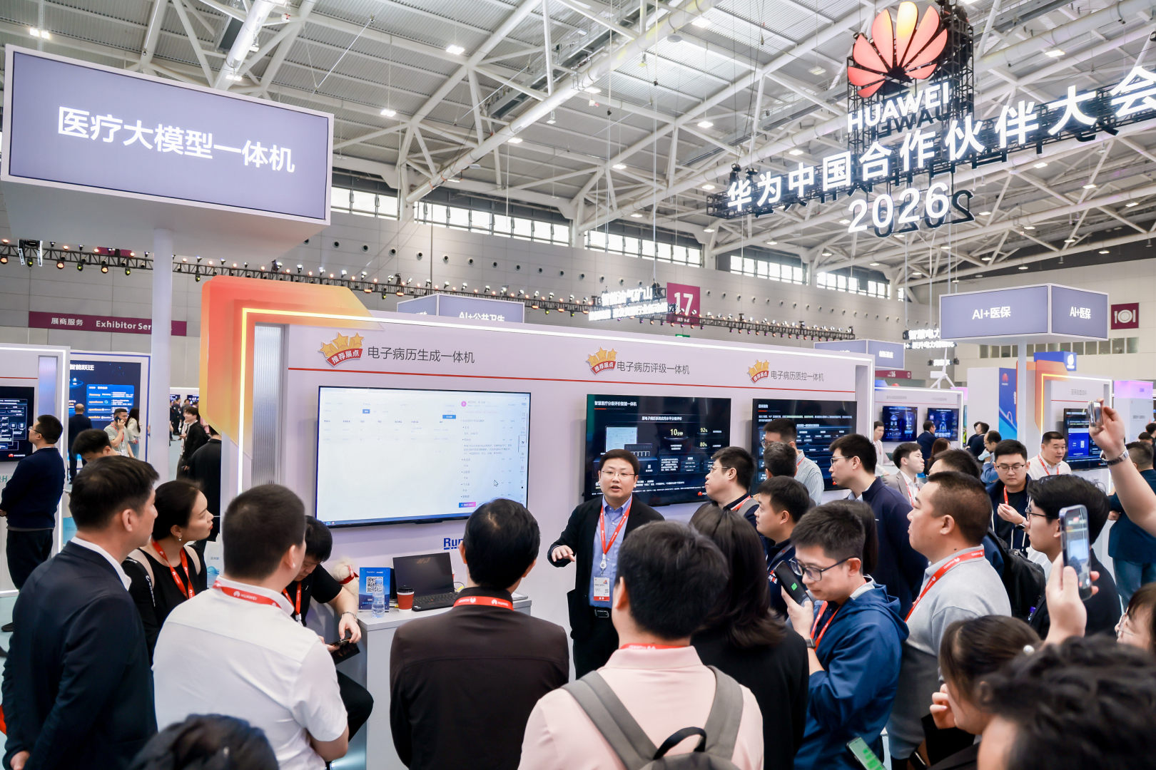 3月19日,华为中国合作伙伴大会2026现场,以“扎根数智医疗,构筑健康中国创新基座”为主题的数智医疗展岛人头攒动。围绕AI+医院、AI+公共卫生、AI+医保等核心方向,华为与伙伴将前沿技术、场景方案、互动体验融为一体,让参观者直观感受到人工智能与数字技术正在深度重构医疗服务全流程。