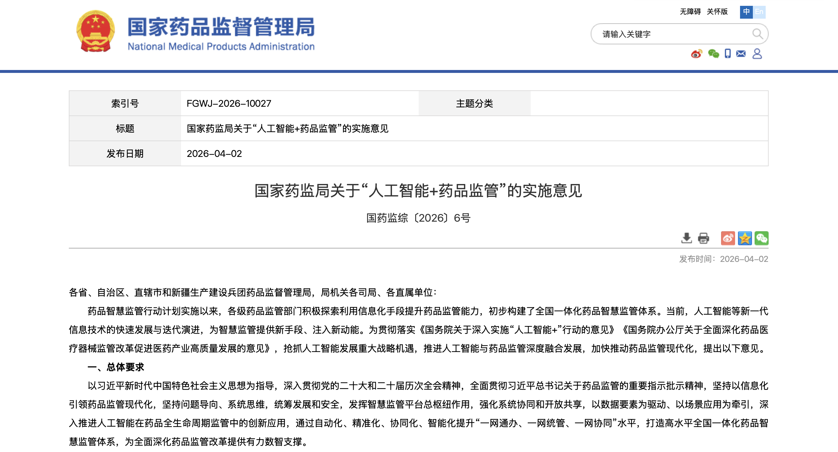 2026年4月2日,国家药监局发布《国家药监局关于“人工智能+药品监管”的实施意见》(以下简称《意见》)。