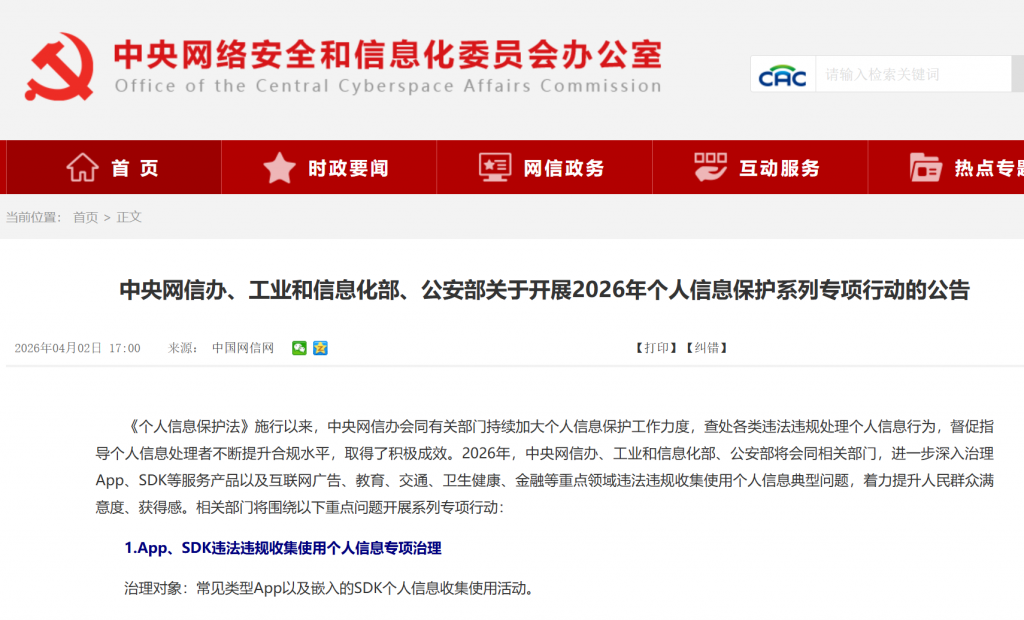 4月2日,中央网信办、工业和信息化部、公安部三部门发布关于开展2026年个人信息保护系列专项行动的公告,进一步深入治理App、SDK等服务产品以及互联网广告、教育、交通、卫生健康、金融等重点领域违法违规收集使用个人信息典型问题,着力提升人民群众满意度、获得感。