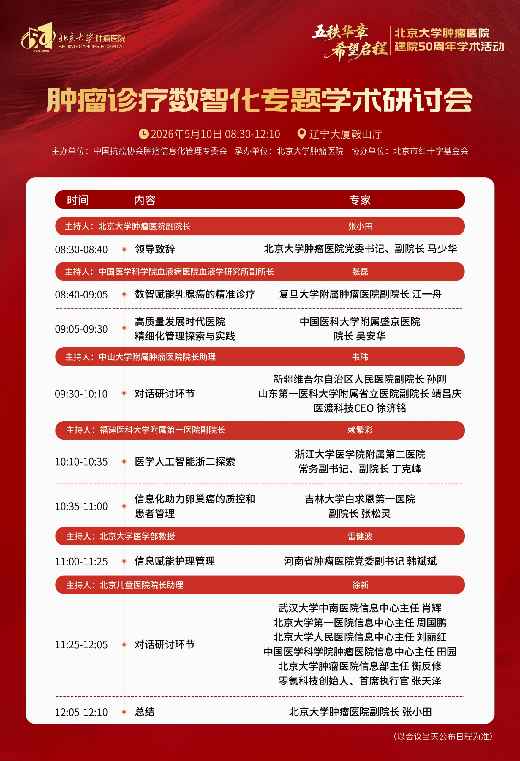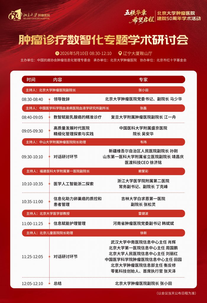 为总结医院五十载发展成果,凝聚行业智慧与公益力量,进一步赋能肿瘤医疗事业高质量发展,北京市红十字基金会联合北京大学肿瘤医院,举办“五秩华章 希望启程”建院50周年学术活动。其中,肿瘤诊疗数智化专题学术研讨会将于5月10日举办,特邀行业专家分享肿瘤诊疗数智化的实践经验。诚挚邀请对此议题感兴趣的业界同仁参加本次活动。