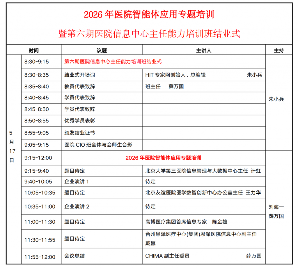 为深入贯彻国家《关于促进和规范“人工智能+医疗卫生”应用发展的实施意见》的部署,及时学习前沿创新技术应用趋势,规范人工智能技术在医疗服务、临床诊疗、医院管理等领域的应用,HIT专家网学苑特组织举办“2026年医院智能体应用专题培训”。