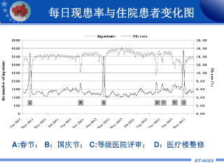 ★ ★ 每日现患率与住院患者变化图 ★ ★ ★ ★ ★ A:春节; B:国庆节; C:等级医院评审; D:医疗楼整修 RT-NISS