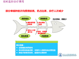 部分单病种的次均费用较高、药占比高,诊疗人次减少 用药情况 患者数量 均次费高,例数少 辅助用药超 床位周转 标使用 较慢 医生人力资 源不足 检验、检查结 果需要时间 医生资源 术前等待 解决措施: 控制辅助用药使用 优化医技检查流程,尽量在入院前完成必要检查 降低术前等待时间,提高床位周转率 复旦大学附属肿瘤医院 FuDan University ShangHai Cancer Center