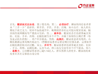 首先,糖尿病无法治愈,属于慢性病;第二,必须治疗,糖尿病将给患者带 来“三多一少”的症状,即多尿、多饮、多食、消瘦,如不治疗,病人将长 期处于疲乏无力、精神不振的痛苦中,晚期病情恶化还可能出现肾衰竭、糖 尿病性视网膜病等严重的并发症;第三,高单价,糖尿病患者的消费遍及预 防、化验、手术、药物、血糖监测等多个环节,并属于持续性长期消费(特 别是试纸和药物),用户单价极高;第四,高频次,糖尿病患者的用药、血 糖监测都需要高频次地进行,I型糖尿病患者需要定期注射胰岛素,需要依靠 血糖监测获取用药提醒;第五,多环节,糖尿病患者的消费遍及预防、化验 、手术、药物、血糖监测、医患互动、网上病友交流等多个环节需求;第六 ,基数大,目前糖尿病患者已逾1.14亿人,潜在携带人群更多,糖尿病的重 度垂直具有足够的市场空间