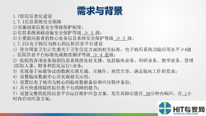 封面标题:30-40pt 颜色:25%黑 需求与背景 封面二级标题:20-25pt 1.7医院信息化建设 字体 : 微软雅黑 1.7.1信息系统安全保障 1)实施国家信息安全等级保护制度; 正文标题:28pt 2)信息系统基础设施安全保护等级 ≥ 3 级; 子目录(2-5级):12-18pt 3)主要面向患者的核心业务信息系统安全保护等级 ≥ 3 级。 颜色: 25%黑 1.7.2以电子病历为核心的医院信息平台建设 1) 符合国家卫生计生委关于卫生信息方面的相关标准,电子病历系统功能应用水平≥4级 字体:微软雅黑 ,医院信息平台标准化成熟度测评等级 ≥ 4 星级; 2) 医院的各项业务得到信息系统的良好支撑,包括临床业务、科研业务、教学业务、管理 配色参考方案: (医院人事、财务和医院运行)业务; 建议同一页面内不 3) 实现基于标准协议的数据互联互通,互操作,高度共享,满足临床工作的要求; 超过四种颜色, 4) 设置临床数据中心并实现相关应用; (仅供参考) 5)设置以电子病历为核心的临床数据备份和应用程序备份; 6)具有快速排除医院信息平台故障的能力; 7)设置完整的医院信息平台运行维护应急方案,发生故障后能在 30分钟内响应,在 1小 时内启动应急方案, 18