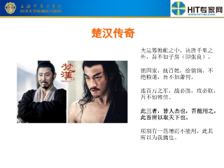 楚汉传奇 夫运筹帷帐之中,决胜千里之 外,吾不如子房(即张良)。 镇国家,抚百姓,给馈饷,不 绝粮道,吾不如萧何。 连百万之军,战必胜,攻必取, 吾不如韩信。 此三者,皆人杰也,吾能用之, 此吾所以取天下也。 项羽有一范增而不能用,此其 所以为我擒也。