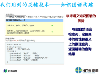 我们用到的关键技术——知识图谱构建 临床语义知识图谱的 优势 根据自然语言 检索词,定位具 体的属性和语义 上的推理查询, 返回精确的查询 结果