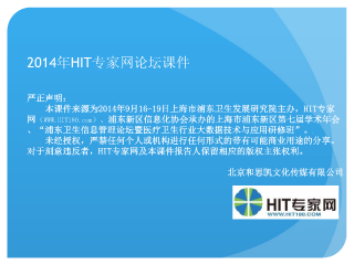 2014年HIT专家网论坛课件 严正声明: 本课件来源为2014年9月16-19日上海市浦东卫生发展研究院主办,HIT专家 网(WWW.HIT180.com)、浦东新区信息化协会承办的上海市浦东新区第七届学术年会 、“浦东卫生信息管理论坛暨医疗卫生行业大数据技术与应用研修班”。 未经授权,严禁任何个人或机构进行任何形式的带有可能商业用途的分享。 对于刻意违反者,HIT专家网及本课件报告人保留相应的版权主张权利。 北京和思凯文化传媒有限公司